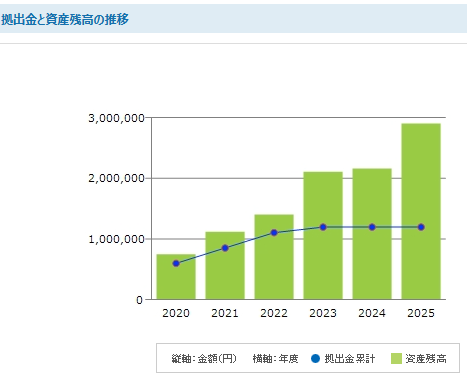 拠出額と資産残高の推移を見ると、積み立てを止めたあとも資産は増えていることが分かります。