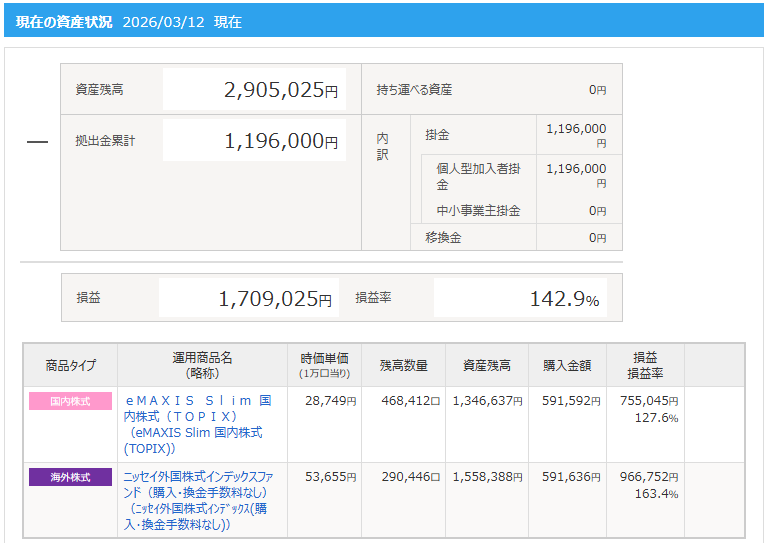 実際に、約120万円を搬出し、2026年1月現在、iDeCo口座には 約280万円の資産が残っています