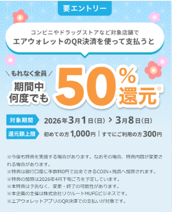 このアプリの魅力は、定期的に実施される高還元キャンペーン。今回は2026年3月8日(日)までの期間限定で「50%(最大1,000円)還元」が受けられる特典が登場しています。