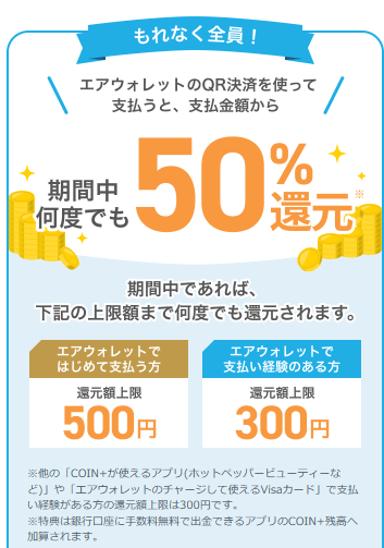 詳しくは本記事の【無印良品も対象!】エアウォレットで50%還元キャンペーンの見出しで紹介しています。