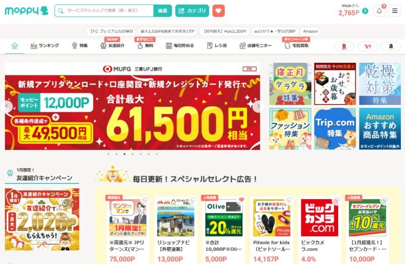 短期間でまとまったポイントを貯めたい月は、モッピーが最適です。キャンペーン時の高額案件が非常に強く、1件で1万円〜1.5万円分が狙えます。