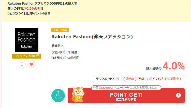 楽天ファッションでポイントサイトを経由して買い物するだけでもお得ですが、楽天独自のキャンペーンと組み合わせると、もらえるポイントがさらに倍増!