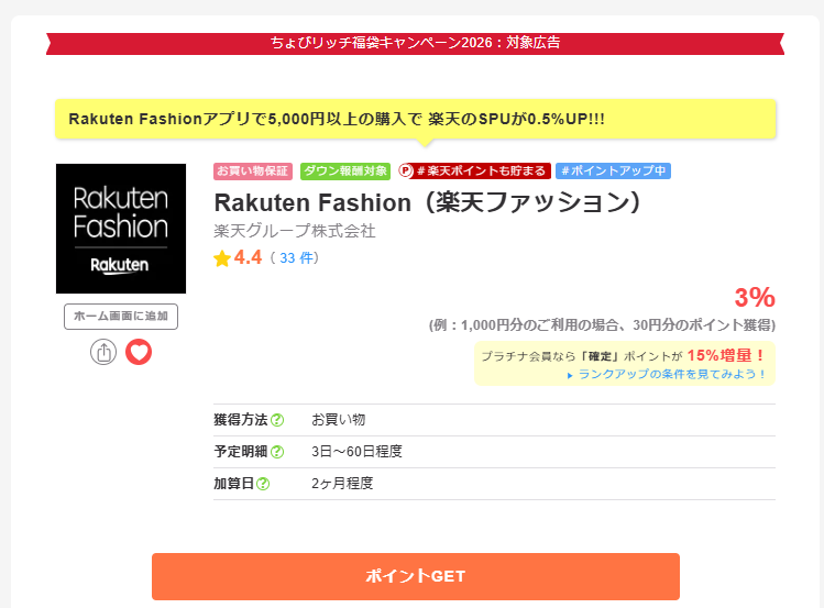 会員数1,200万人以上を誇る大手ポイントサイト。楽天ファッションの還元率は4.0%と非常に高く、当ブログ経由なら2,000円相当の特典も受け取れます。